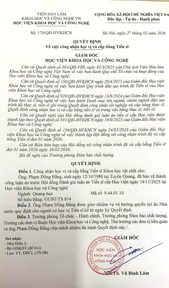 Trong không khí phấn khởi của những ngày đầu xuân 2026 và quyết tâm thực hiện thắng lợi các chỉ tiêu Nghị quyết của Chi bộ, Khoa Cơ sở - Cơ bản xin được gửi lời chúc mừng nồng nhiệt nhất tới thầy Phạm Đồng Bằng đã chính thức nhận quyết định công nhận học vị Tiến sĩ. Theo Quyết định số 170/QĐ-HVKHCN ngày 27/02/2026 của Giám đốc Học viện Khoa học và Công nghệ, đồng chí Phạm Đồng Bằng đã được công nhận học vị và cấp bằng Tiến sĩ Khoa học vật chất, chuyên ngành Quang học (Mã số: 9.44.01.10).